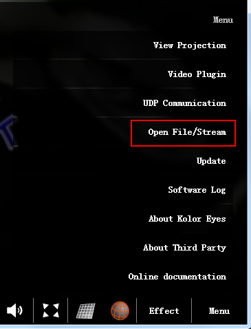 1、安装并打开 Kolor Eyes,点击右下角的【Menu】会弹出文件菜单,然后按下面的方法操作,打开视频文件