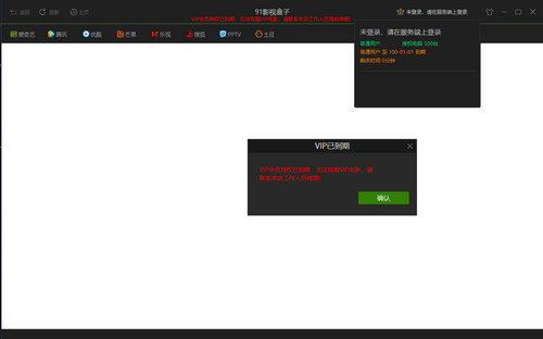 8、打开91kan.exe程序,会出现提示:VIP会员特权已到期,无法观着VIP电影,请联系本店工作人员提前续期