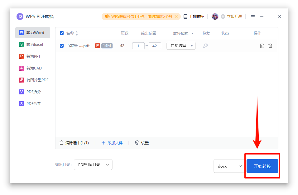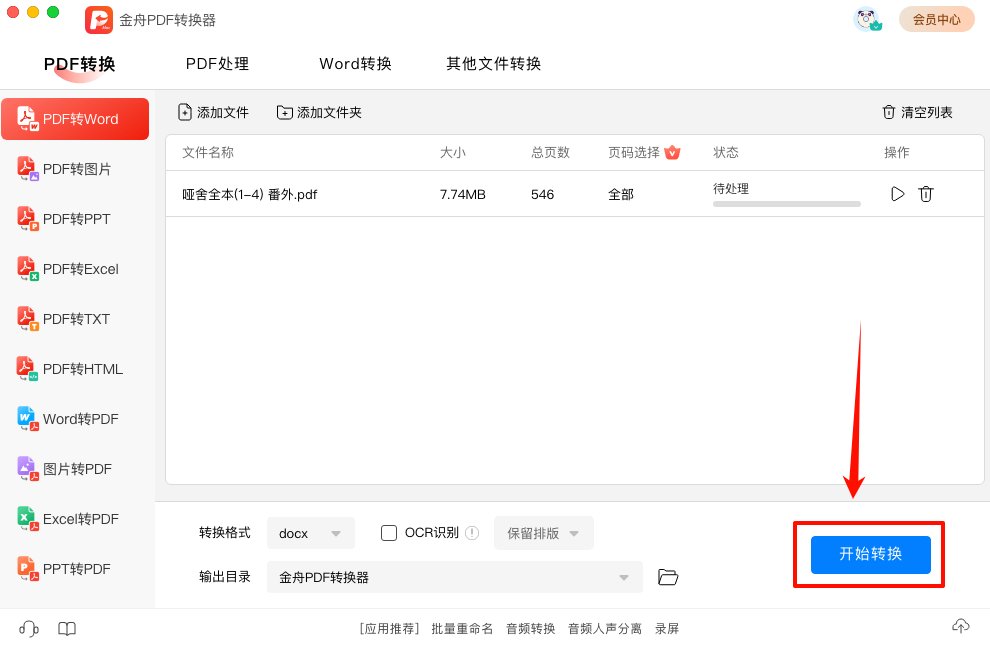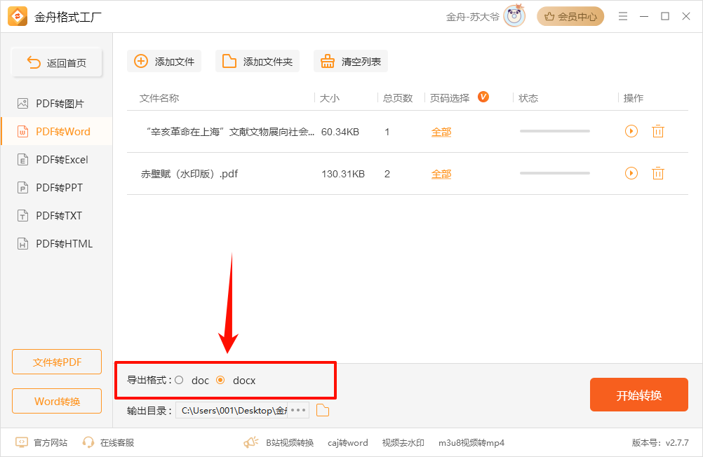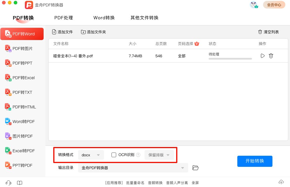 第二步、PDF文件添加之后,设置转换格式docx/doc,还可以勾选ocr进行扫描文件识别。