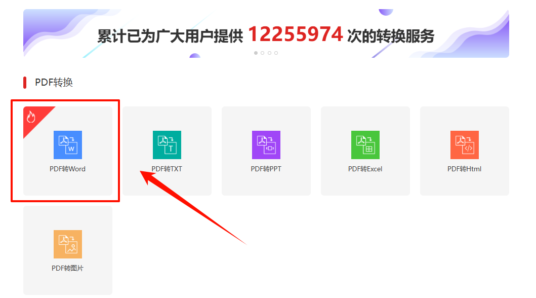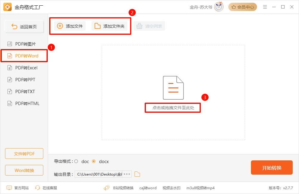 第一步、打开转换工具,选择【PDF转Word】,点击添加文件/拖拽文件到软件提示区域。