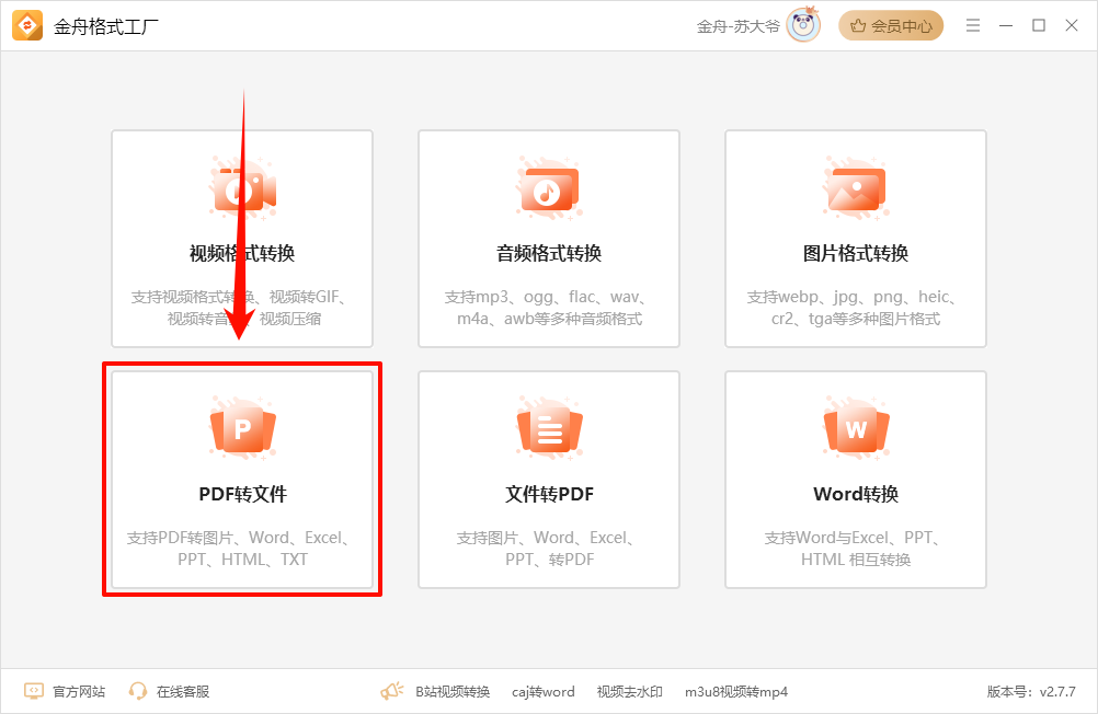 第一步、安装运行金舟格式工厂,首页面选择点击【PDF转文件】功能模块。
