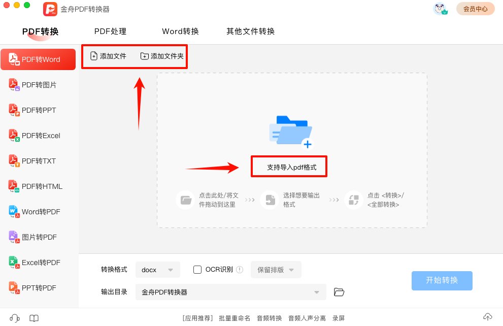第一步、安装金舟PDF转换器,双击桌面的快捷方式,运行进入软件页面。左侧功能栏中默认选择PDF转Word功能,添加PDF文件或者批量拖拽需要转换文件进入软件空白处。
