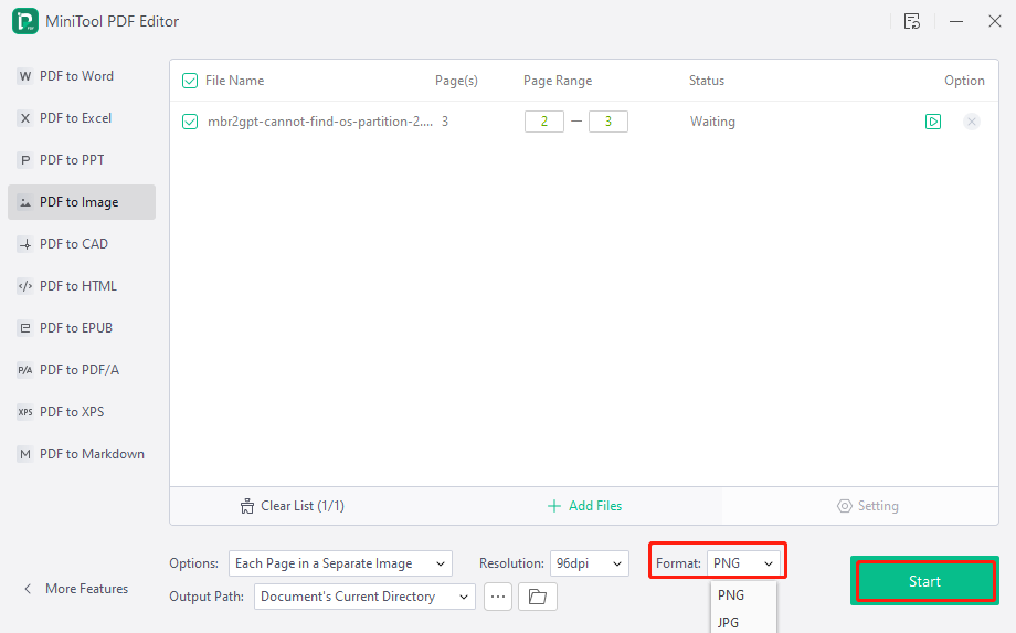 步骤3、在弹出的窗口中,从【Format】下拉菜单中选择【PNG】图片格式,然后点击【Start】即可开始转换pdf文件。 在这里,您可以根据自己的需要设置其他输出参数。