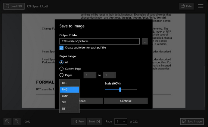 步骤2、点击左下角的【Save】保存按钮。 现在您可以设置输出文件夹、页面范围、输出格式和缩放选项。 设置完成后,点击【Continue】就能将pdf文档保存为png图片了。