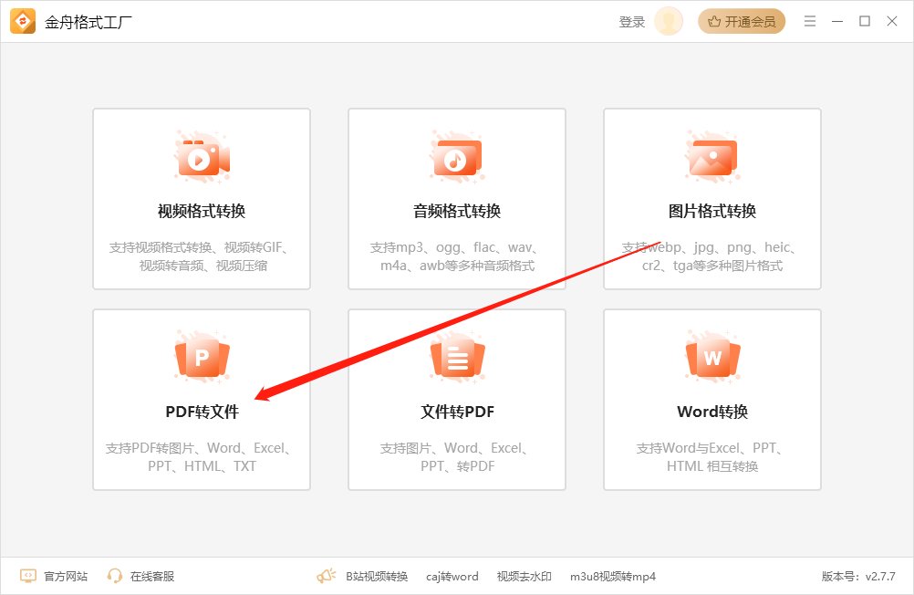 步骤1、windows电脑上启动【金舟格式工厂】软件,点击【PDF转文件】功能。
